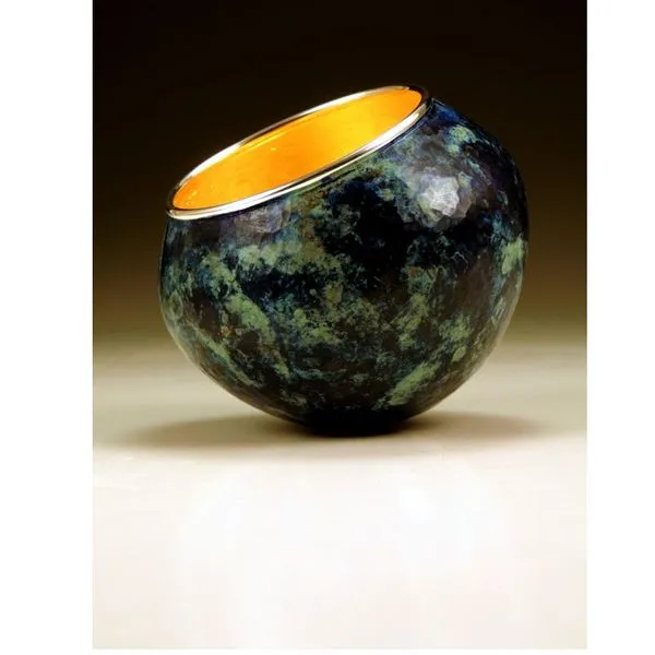 The materials each lend their voices to the final piece. Copper shows us what it means to be malleable by bending, compressing, and stretching readily to take on any form. Yet, retaining the strength to keep a shape. The patinas offer us up a richness of color and surface when conferring with the copper. Sterling silver gives a quiet elegance in it’s role of defining the edge. It’s color transitions nicely between the interior and exterior, reflecting to us a bit of both.